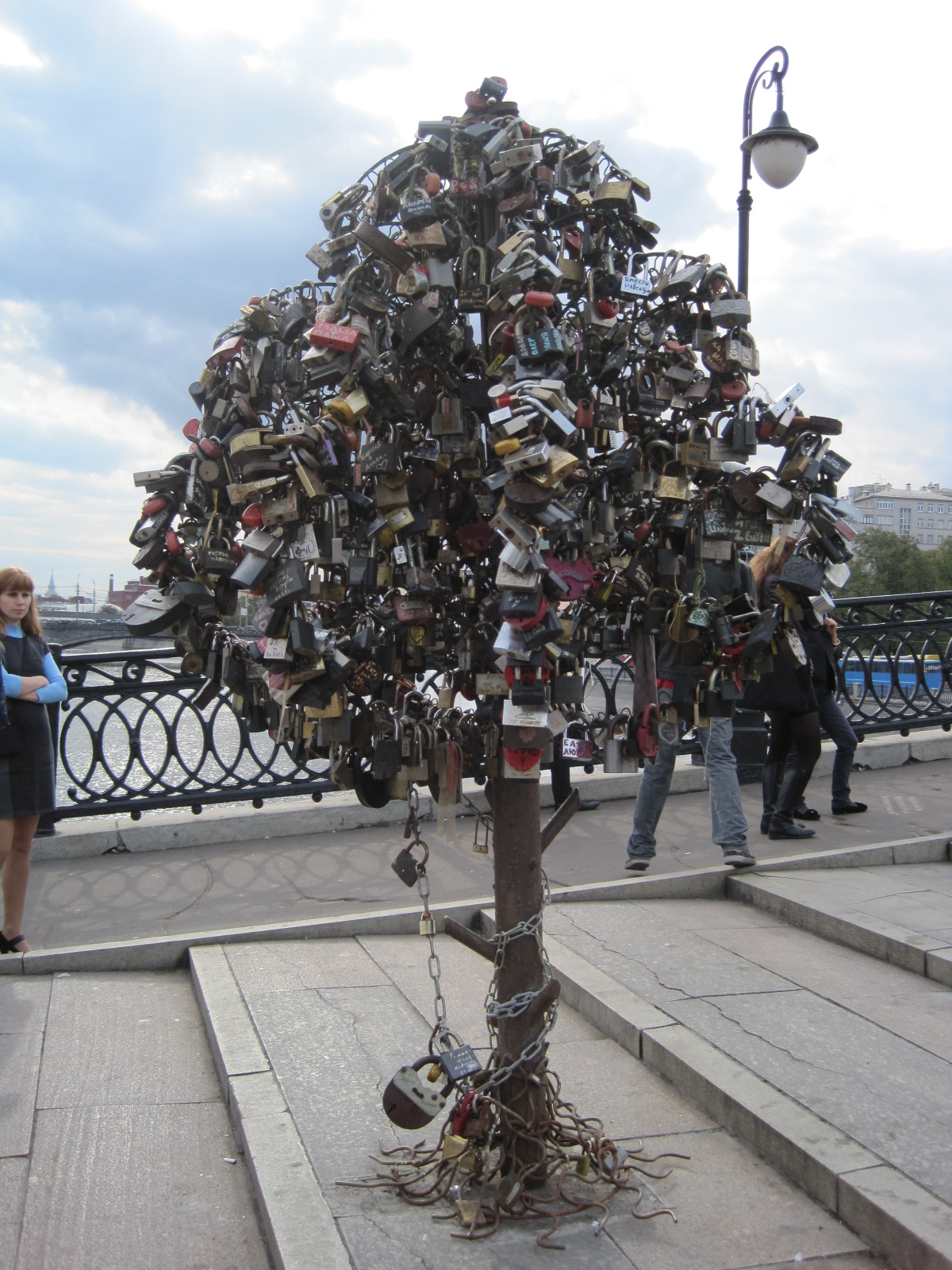 < return to all posts 09 21 10 From Russia with Love While on a trip to Russia I came across a custom they have there. On the day of their wedding, couples attach a padlock with their initials on it to metal trees that are located on bridges in the city. Then they throw the key away into the river!