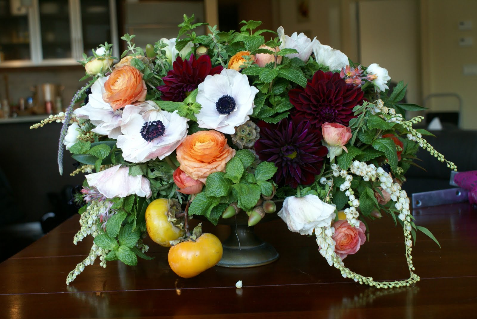 there are some events where i just can’t bear to leave the flowers behind after all the guests have left. i couldn’t help myself last night, so i rescued a few and brought them home. these are composed of dahlias, ranunculus, anenome, choclate cosmo, persimmons, andromeda, acorns, scabiosa pods, fresh mint, and fresh oregano.